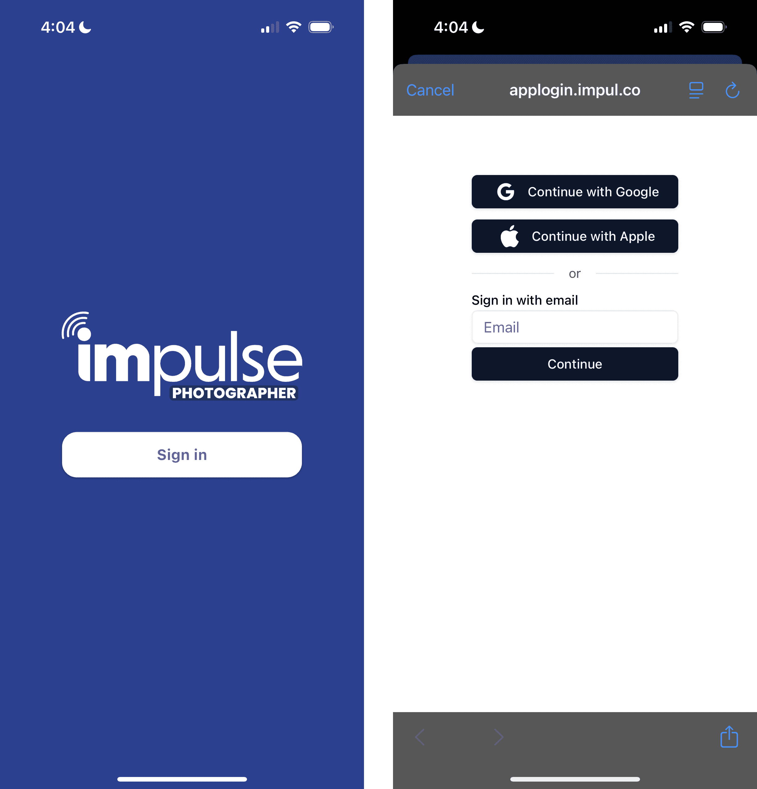 Before being able to use the app you need to be added as a photographer to the Impulse event. If that's not the case, reach out to your Impulse contact, or add it in the "Contributors" tab of the Impulse webapp.