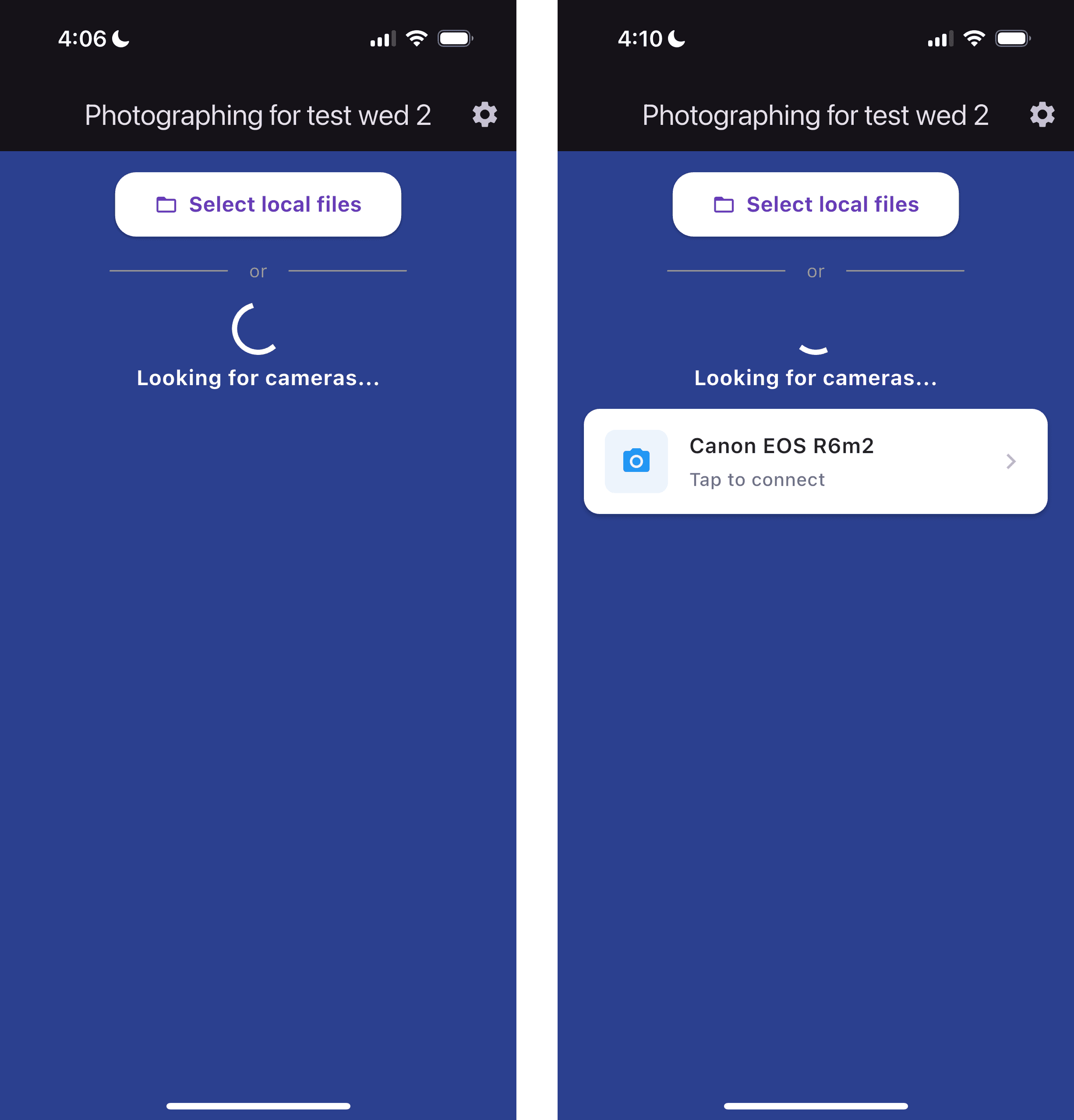 Once you select an event you should see this screen, in addition to a few permission dialogs (Local network access, USB port access): make sure to accept all of them or the app will not be allowed to connect to the camera